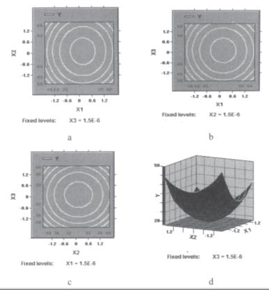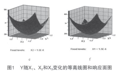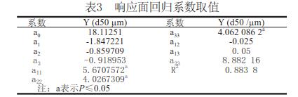 利用響應(yīng)面分析法[1]化枸杞子渣超微粉碎工藝參數(shù)。在單因素預(yù)試驗基礎(chǔ)上,用SAS軟件系統(tǒng)進行響應(yīng)面分析,設(shè)計一個三因素五水平的回歸方程來擬合因素和指標(biāo)(響應(yīng)值)之間的函數(shù)關(guān)系。選擇球料比(X1)、枸杞子渣漿液濃度(X2)和攪拌器轉(zhuǎn)速(X3)作為因素,以粉碎后的顆粒粒度d50作為響應(yīng)值對球磨機濕法超微粉碎工藝進行化。